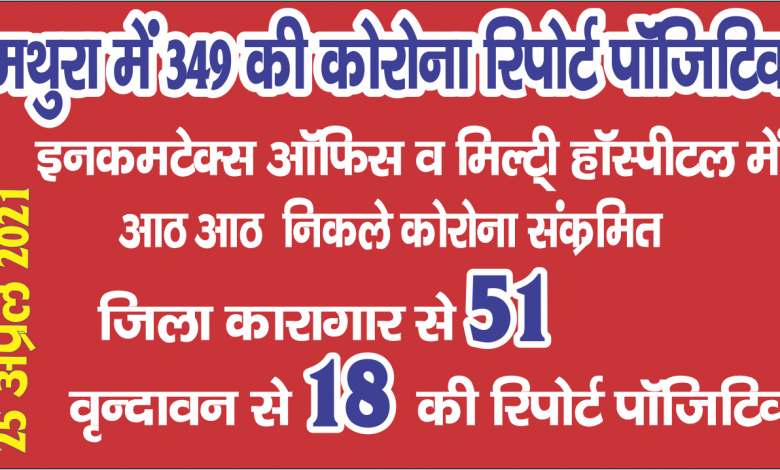 ्मथुरा जनपद मे ं349 की आयी पाॅजिटिव रिपोर्ट, जिला कारागार में 51 व इनकमटेक्स विभाग के कार्यालय व मिल्ट्ी हाॅस्पीटल मे निकले आठ आठ कोरोना संक्रमित
