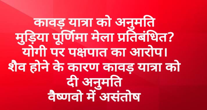कावड़ यात्रा को अनुमति मुड़िया (गुरु) पूर्णिमा मेला प्रतिबंधित? योगी पर पक्षपात का आरोप। शैव होने के कारण कावड़ यात्रा को दी अनुमति, वैष्णवो में असंतोष
