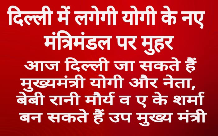 मुख्यमंत्री योगी आदित्यनाथ के नेतृत्व में गठित होने वाली भाजपा की नई सरकार के मंत्रिमंडल के सदस्यों पर दिल्ली में मोहर लगेगी। मुख्यमंत्री योगी आदित्यनाथ, भाजपा प्रदेश अध्यक्ष स्वतंत्र देव सिंह और उप मुख्यमंत्री केशव प्रसाद मौर्य सहित अन्य नेता शुक्रवार को दिल्ली जा सकते है।
