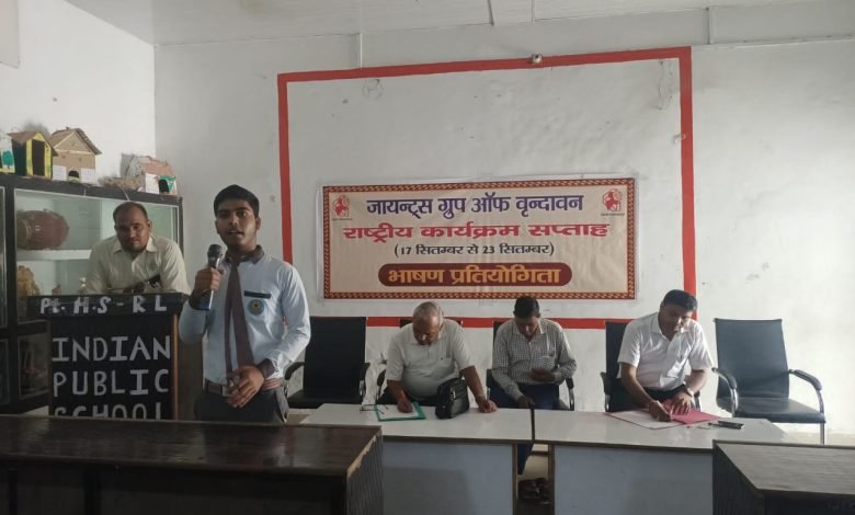 सुनरख रोड स्थित इण्डियन पब्लिक स्कूल वृन्दावन में जाॅयन्टस गु्रप के तत्वावधान में भाषण प्रतियोगिता का आयोजन किया गया। जिसका विषय ‘‘जल संरक्षण’’ था। इस भाषण प्रतियोगिता में जूनियर व सीनीयर वर्ग के छात्र/छात्राओं ने उत्साह पूर्वक भाग लिया। कक्षा षष्ठम से अष्टम तक के छात्र छात्राओं को जूनियर वर्ग और कक्षा नवम् से द्वादश के छात्र छात्राओं को सीनियर वर्ग में बाँटा गया। इस प्रतियोगिता में बच्चों ने अपनी प्रतिभा का प्रदर्शन करके सभी को मंत्रमुग्ध कर दिया।